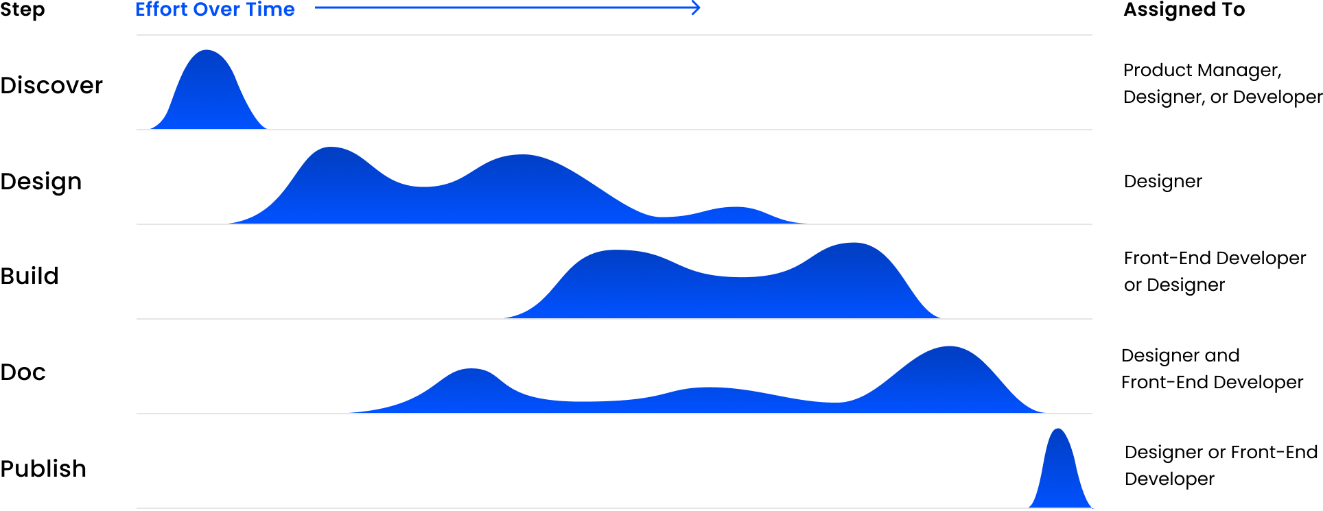 We created a workflow that reflected how teams actually work. The process followed five phases: Discover, Design, Build, Document, and Publish. Each phase had clear checkpoints but allowed overlap when collaboration improved speed or quality.